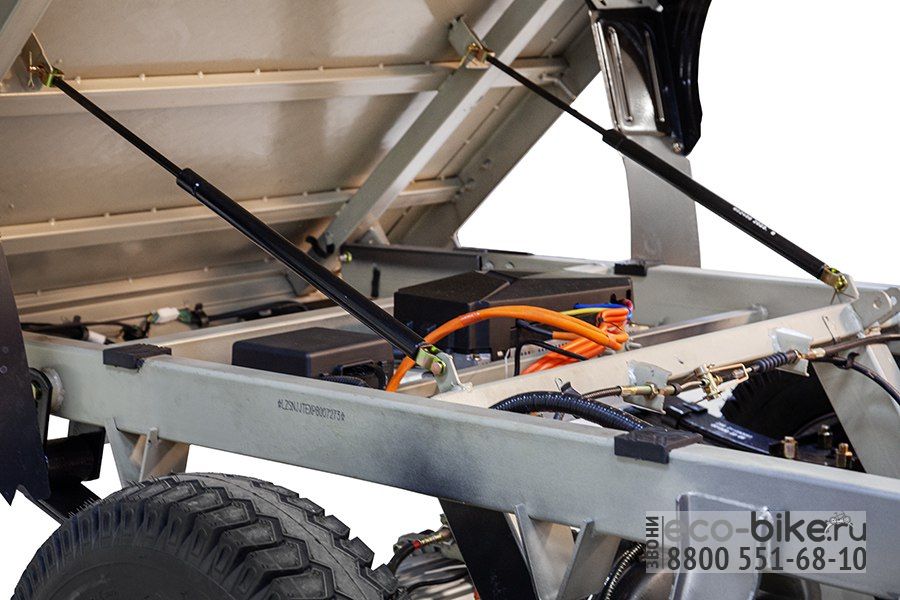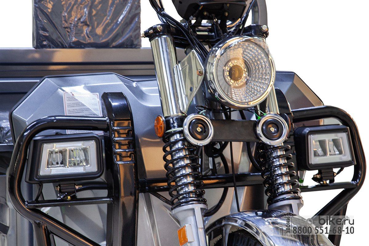 Трицикл оснащён мощным контроллером на 150 А, который обеспечивает плавный старт даже на крутых подъёмах. Информативная цифровая панель отображает рабочее напряжение, уровень заряда аккумуляторов, скорость и температуру воздуха. Также предусмотрен вместительный отсек под сидением водителя для хранения инвентаря и личных вещей.